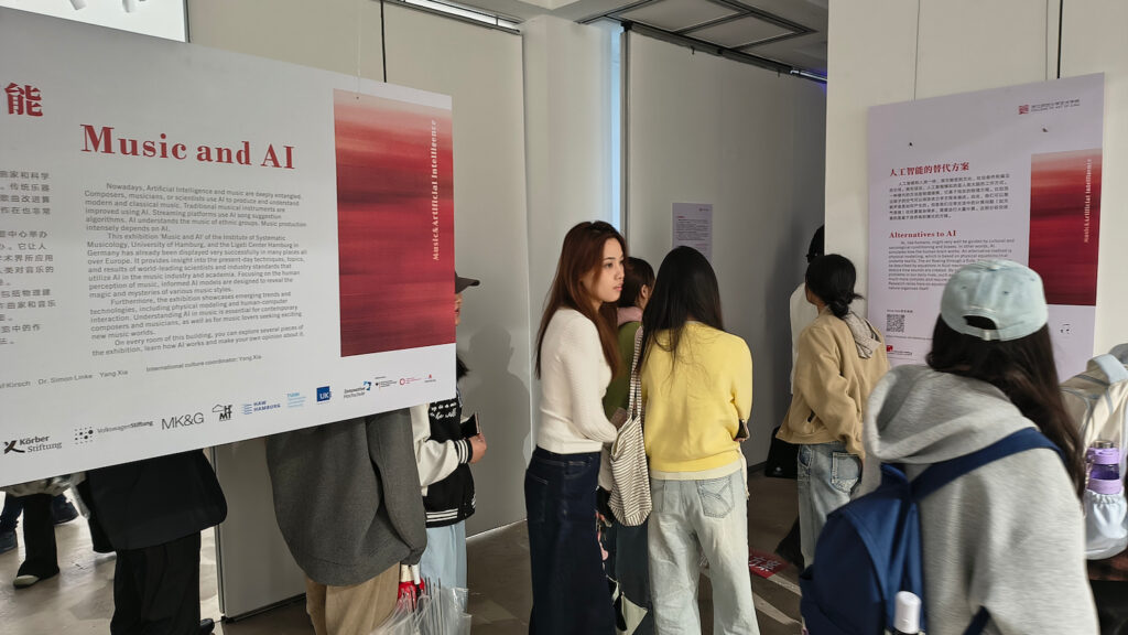 Im Mittelpunkt der Reise stand eine Ausstellung zum Thema KI und Musik an der Zhejiang Normal University in Jinhua. Die Ausstellungsinhalte, die von elektronischer Tanzmusik über Filmmusik und Akustik bis hin zu Instrumentenbau und traditioneller Musik verschiedener Kulturen reichen, wurden 2023 ursprünglich in Zusammenarbeit mit Prof. Rolf Bader (Universität Hamburg) für die Ausstellung „Can You Hear It“ am Museum für Kunst und Gewerbe in Hamburg entwickelt. Nun konnten sie in aktualisierter und angepasster Form auch in China präsentiert werden. Simon Linke betont: „Besonders spannend war der direkte Austausch darüber, wie sich ethnische Gruppen in der Darstellung wiederfinden und ob diese Perspektiven auch in Deutschland angemessen werden können, nicht zuletzt vor dem Hintergrund der kolonialen Vergangenheit Hamburgs, deren Spuren such direkt vor den Türen des ligeti zentrums zeigen.“