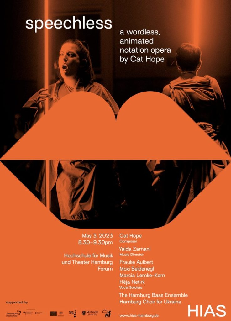 Speechless ist eine wortlose, animierte Notationsoper, die eine persönliche Antwort auf die Erfahrungen von Flüchtlingen in aller Welt sein soll. Sie wurde 2019 beim Perth Festival uraufgeführt und erhielt 2020 den AMC APRA AMCOS Art Music Award für das beste neue dramatische Werk und wurde für den Helpmann Award für die musikalische Leitung nominiert. Dies ist die europäische Erstaufführung der Kammerkonzertfassung mit Hamburger Besetzung.