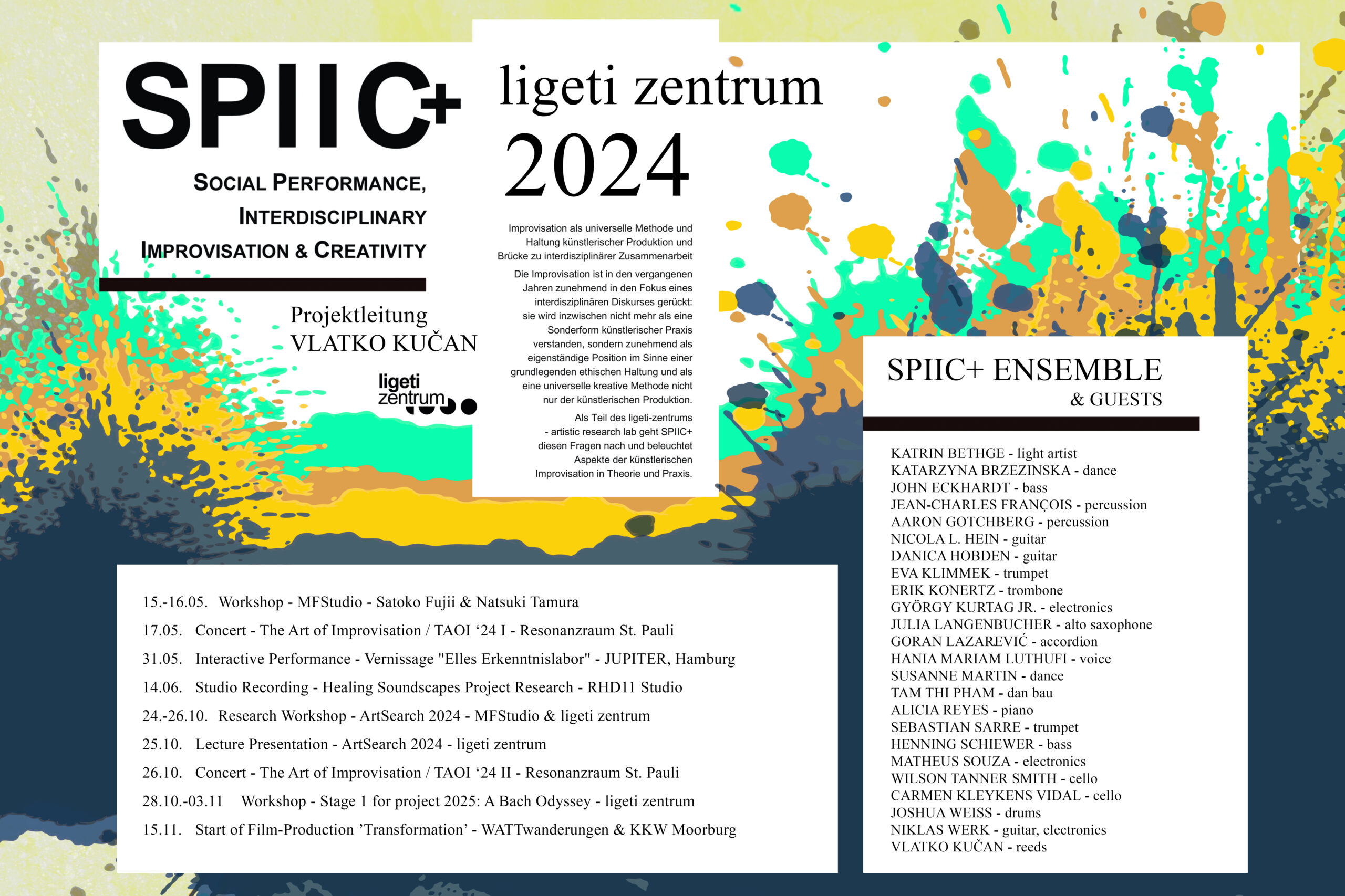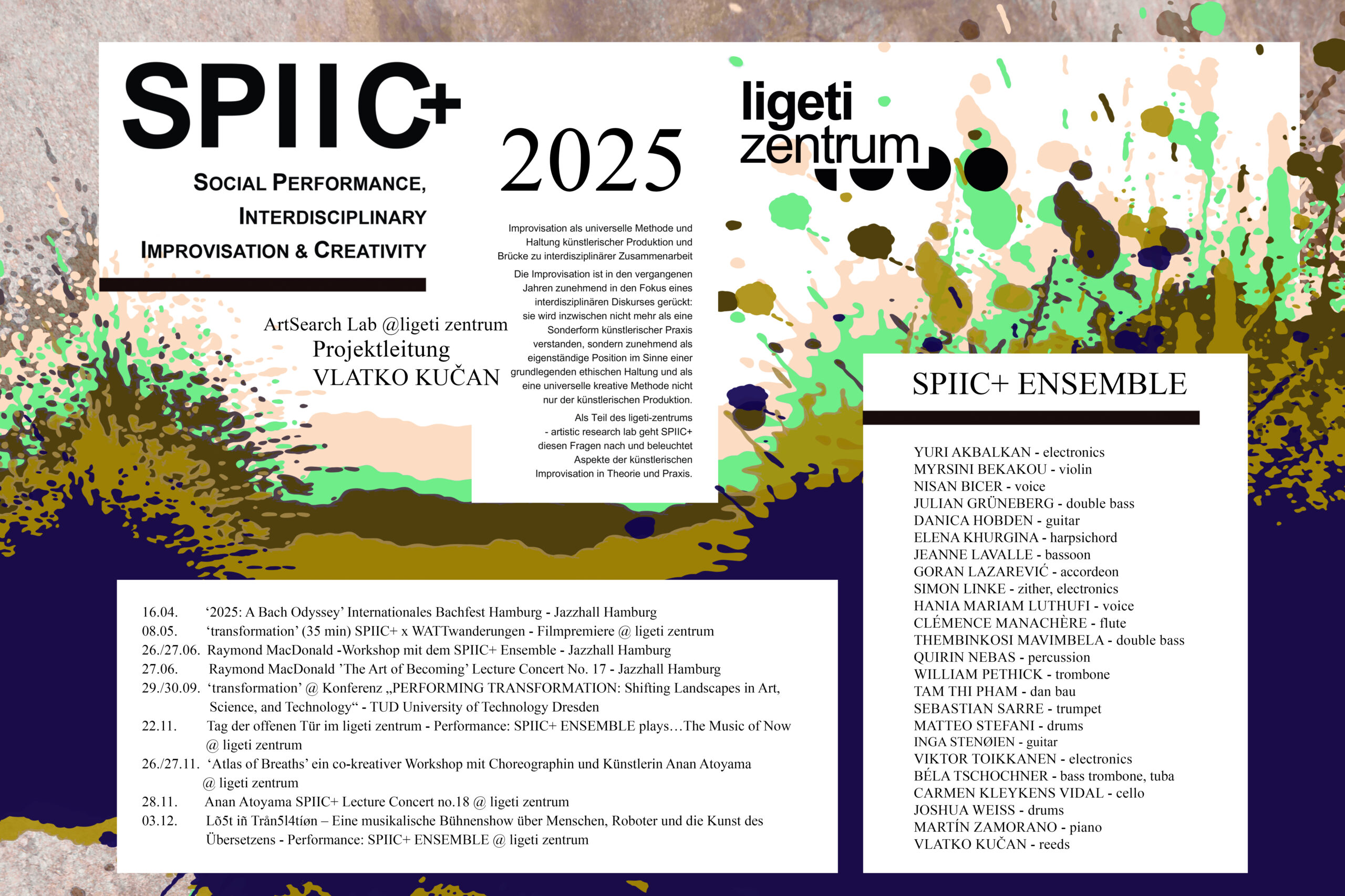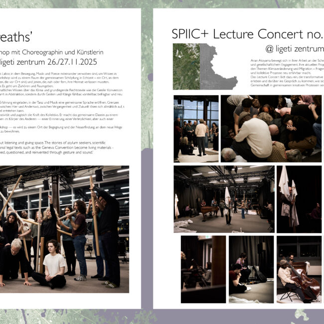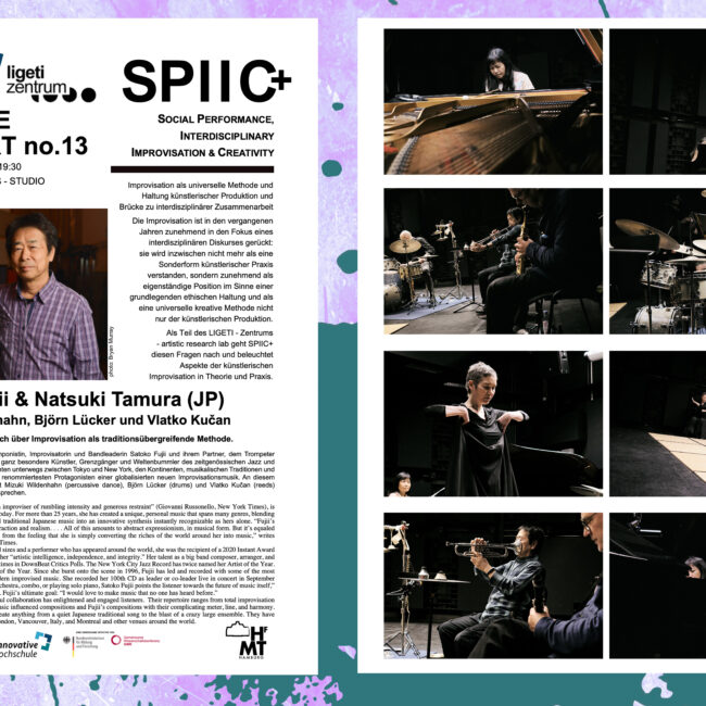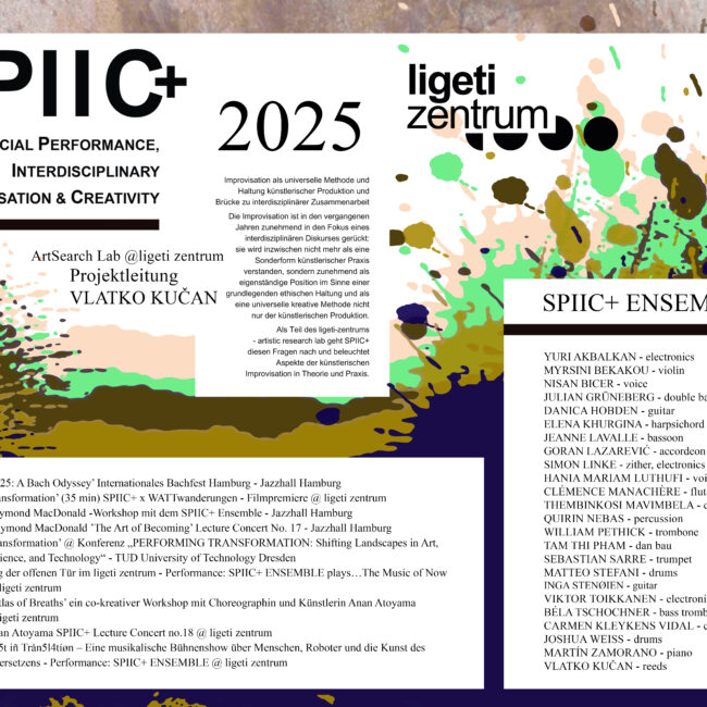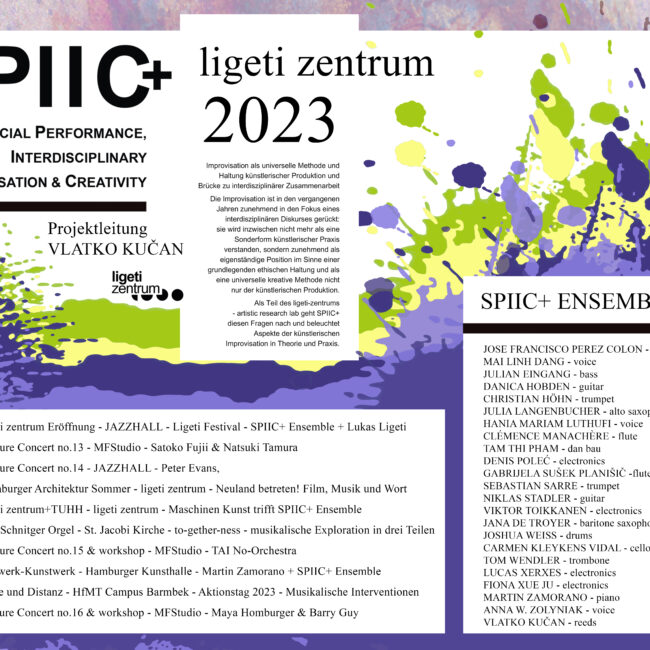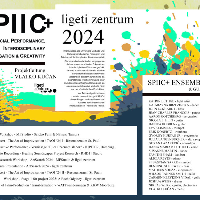 Das 2018 gegründete Projekt SPIIC+ betätigt sich im Feld der Critical Improvisation Studies mit künstlerischer Improvisation als einer grundlegenden ethischen Haltung, sozialen Interaktionsgestaltung und universellen ko-kreativen Methode. Dem aus Studierenden verschiedener Studiengänge zusammengestellten SPIIC+ Ensemble kommt dabei eine zentrale Rolle zu. Im ligeti zentrum baut SPIIC+ auf einem breiten Portfolio öffentlichkeitswirksamer Konzerte und Veranstaltungen auf und setzt diese fort.