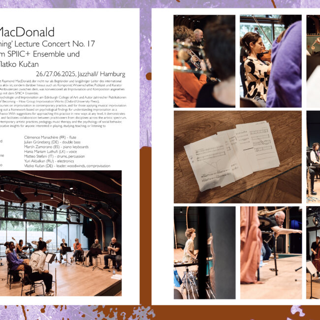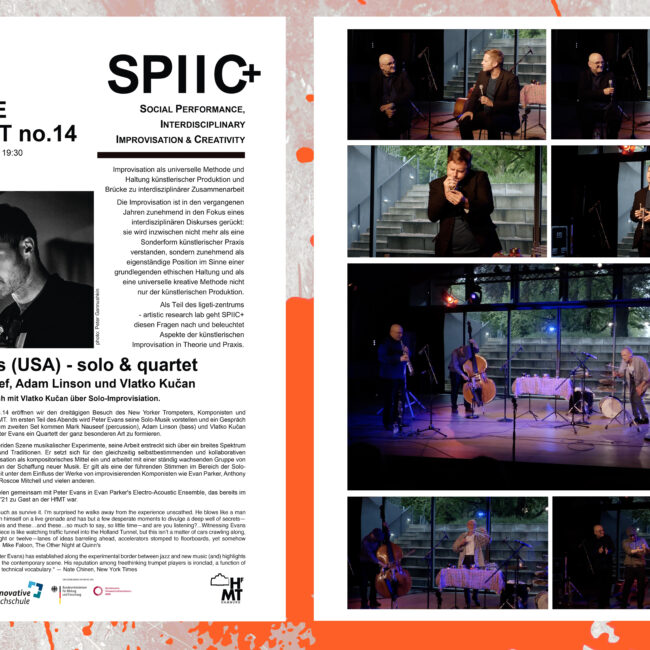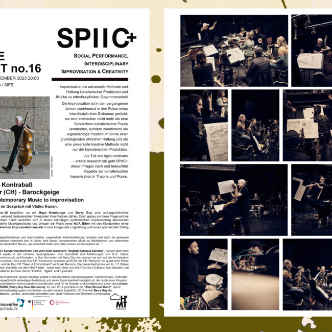 Das Akronym SPIIC+ steht für Social Performance, Interdisciplinary Improvisation & Creativity und beschäftigt sich als Teilprojekt des Artistic Research Labs mit künstlerischer Forschung im Feld der ‘Critical Improvisation Studies’ – und damit in einem hochaktuellen und dynamischen Feld transdisziplinärer künstlerischer und sozialer Forschung und Praxis.