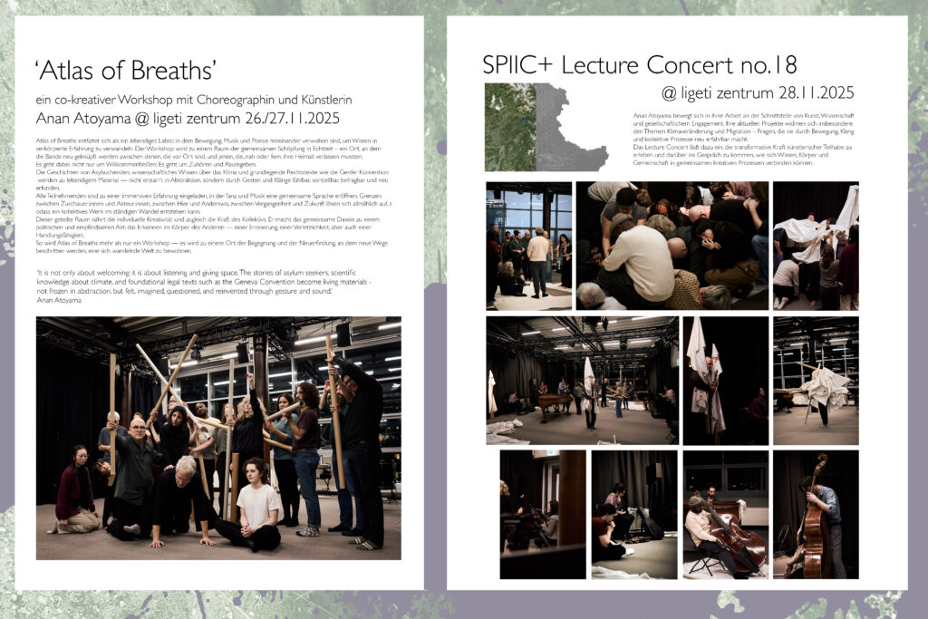 SPIIC+ blickt somit auf eine lange Reihe und Kontinuität von vielbeachteten Aktivitäten und Projekten zurück, die stets einem transdisziplinären Transfer und der Initiierung neuartiger, tradierte Grenzen überschreitender künstlerisch-sozialer Erfahrungen verpflichtet waren und sind. Neben zahlreichen Konzerten, bei denen das sich stets neu konstituierende SPIIC+ Ensemble im Mittelpunkt steht, sind immer wieder auch Kollaborationen mit aktuellen Projekten im öffentlichen und digital-virtuellen Raum entstanden. Darüber hinaus gibt es eine kontinuierlich fortlaufende Reihe von SPIIC+ lecture concerts und Workshops mit internationalen renommierten Gästen. Zunehmend widmet sich SPIIC+ auch Projekten, die verschiedene künstlerische Disziplinen miteinander Verbinden – neben Musik und Klangkunst auch Tanz, Literatur und Film.